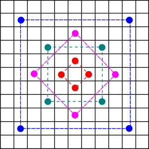 The first step is to produce the sampling kernels. For sampling 16 pixels, you produce a set of 4 kernels, each sampling 4 pixels and sequentially rotated 45 degrees as the kernels expand outwards from the centre.
